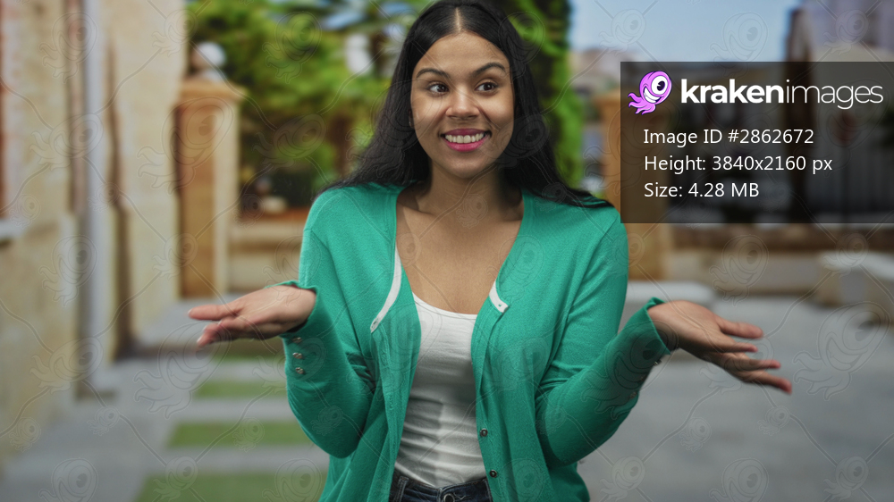 Woman in green cardigan with raised palms shrug pose in front of a modern building facade; uncertainty.