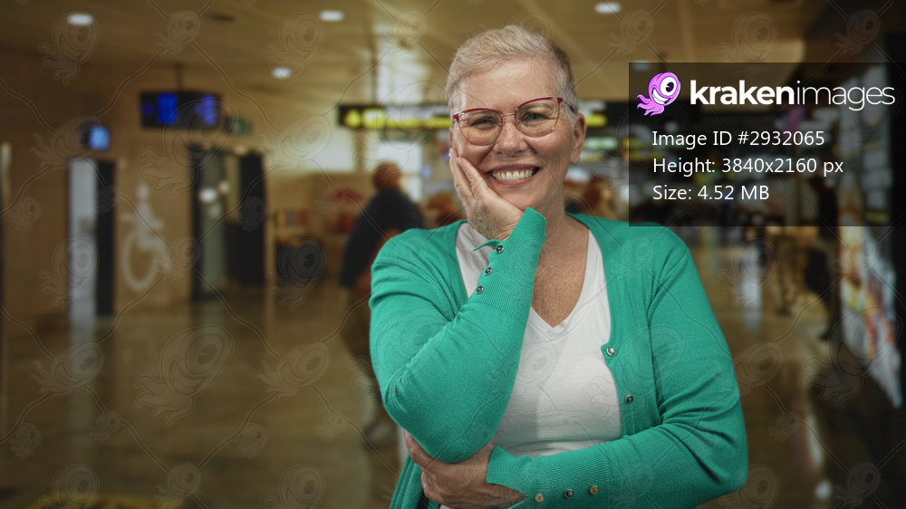 Woman in green cardigan smiling with hand on cheek and pink glasses in airport terminal near signage and wheelchair symbol; travel confidence happiness. - Kraken Images