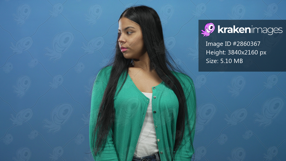 Woman in green cardigan and white top with long black hair turning head to the side in studio; curiosity.