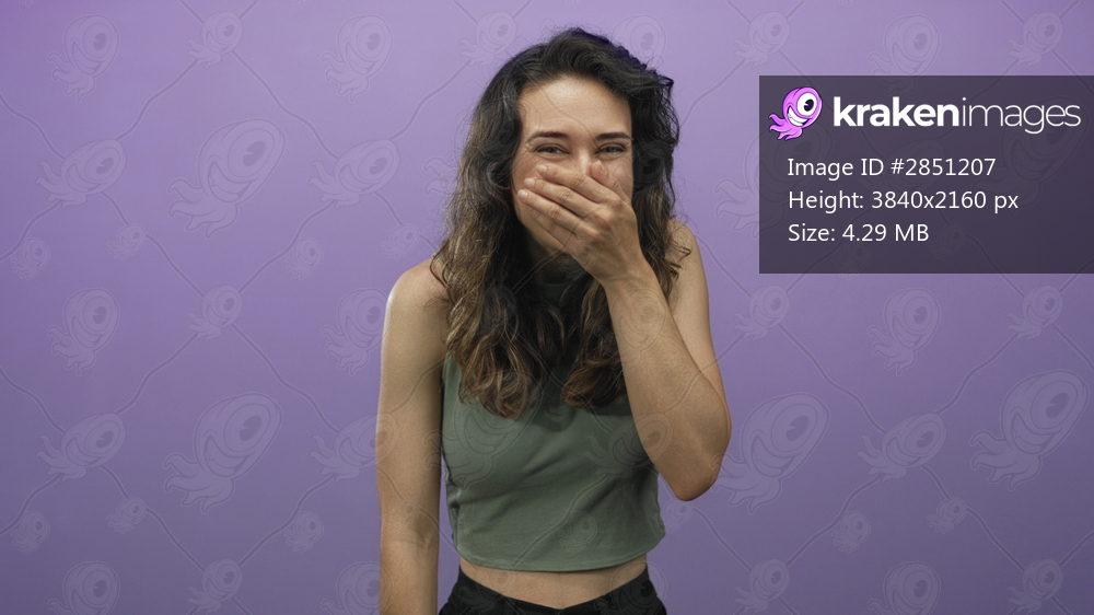 Woman in green crop top laughs while covering mouth with hand and pointing thumb in a studio; joy.