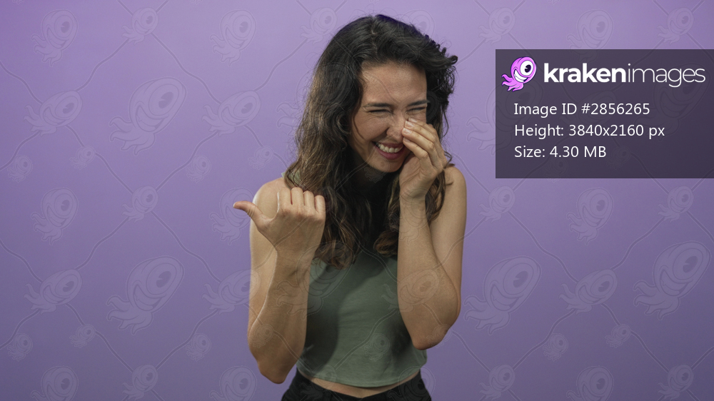Woman in green crop top laughs while covering mouth with hand and pointing thumb in a studio; joy.