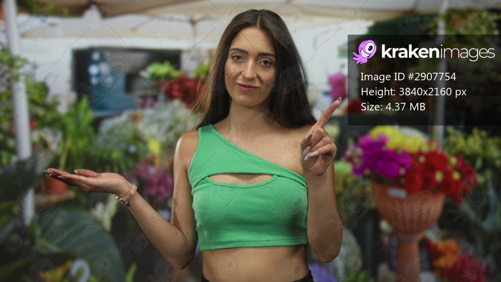 Woman in green crop top points index finger up with other palm up on street flower market; lighthearted doubt.