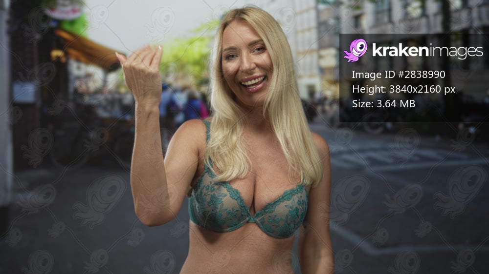Woman in green lace bra shouting with hands around mouth showing exposed cleavage on city street; confidence empowerment.
