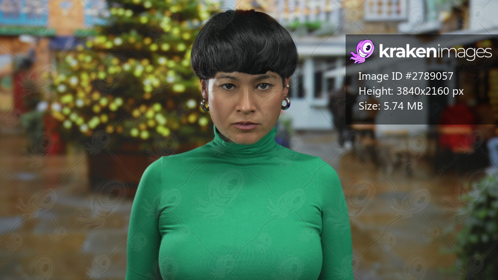 Woman in green long sleeve standing on city street with christmas lights in background during holiday season evening