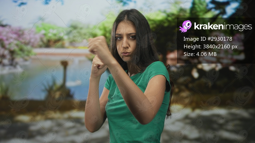 Woman in green shirt punches forward with fists in a forest scene, arms raised in boxing guard; determination self defense.