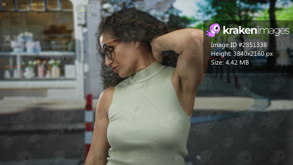 Woman in green sleeveless top and glasses holds neck in front of busy shop window on street; discomfort.