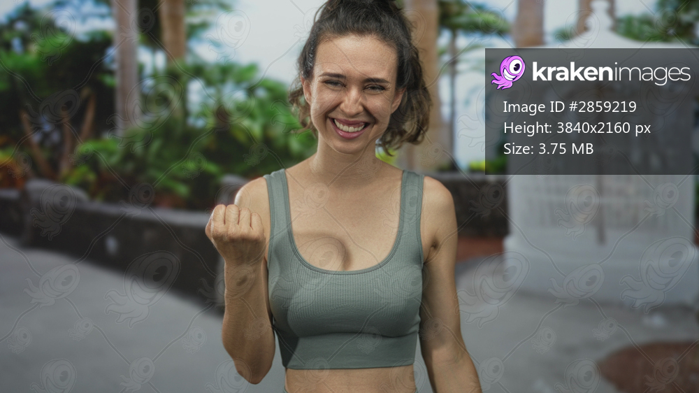 Woman in green sports bra pumping clenched fists and smiling broadly at park under leafy canopy; joy confidence triumph.