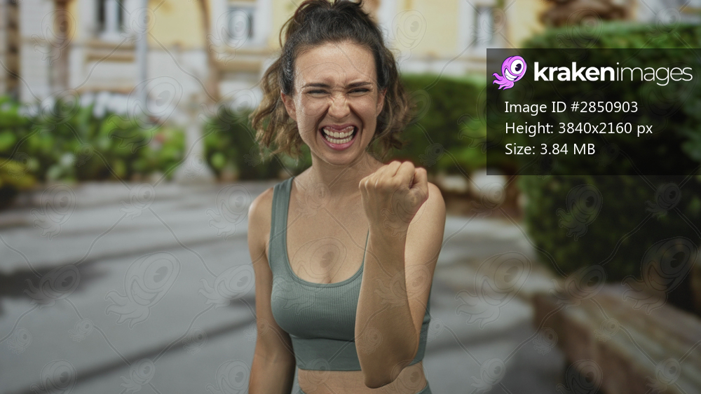 Woman in green sports top shouting with open mouth and pointing finger on sunlit street; triumph joy.
