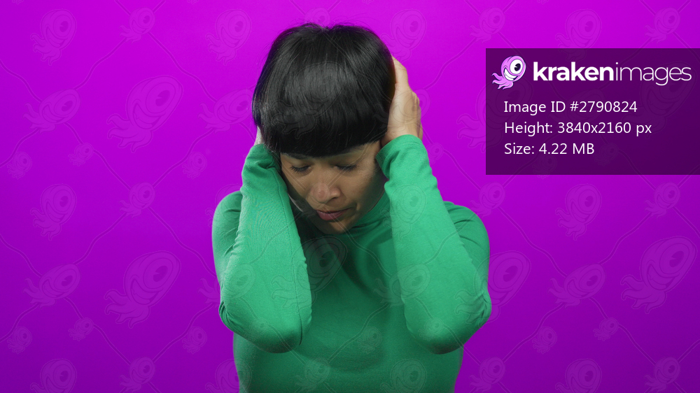 Woman in green sweater covers ears, appearing distressed against vivid purple backdrop, emphasizing emotion, isolation, and stark color contrast in studio setting. - Kraken Images