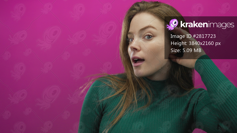 Woman in green sweater cups her hand to ear and opens mouth in pink studio with curious tilt of head; surprise attention curiosity intrigue.