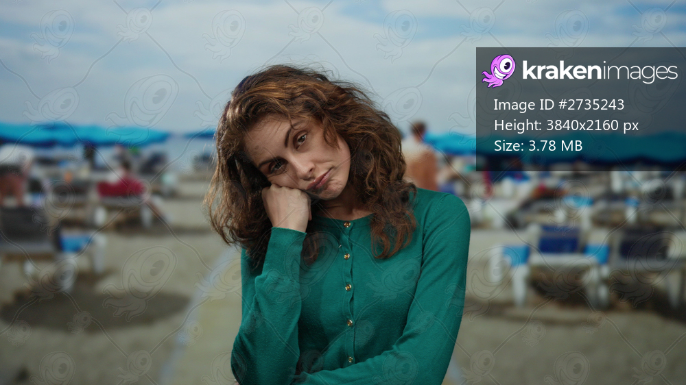 Woman in green sweater looking sleepy on the beach with sunbeds and umbrellas in the background, capturing a lazy seaside vibe at the shore.