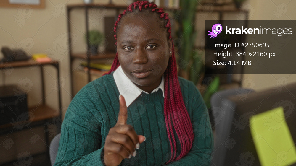 Woman in green sweater with red braids sits in office pointing finger with serious expression in modern workplace interior setting.