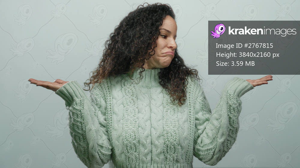 Woman in green sweater shrugs with arms outstretched isolated on white background conveying uncertainty emotion in studio setting with casual style and hispanic ethnicity - Kraken Images
