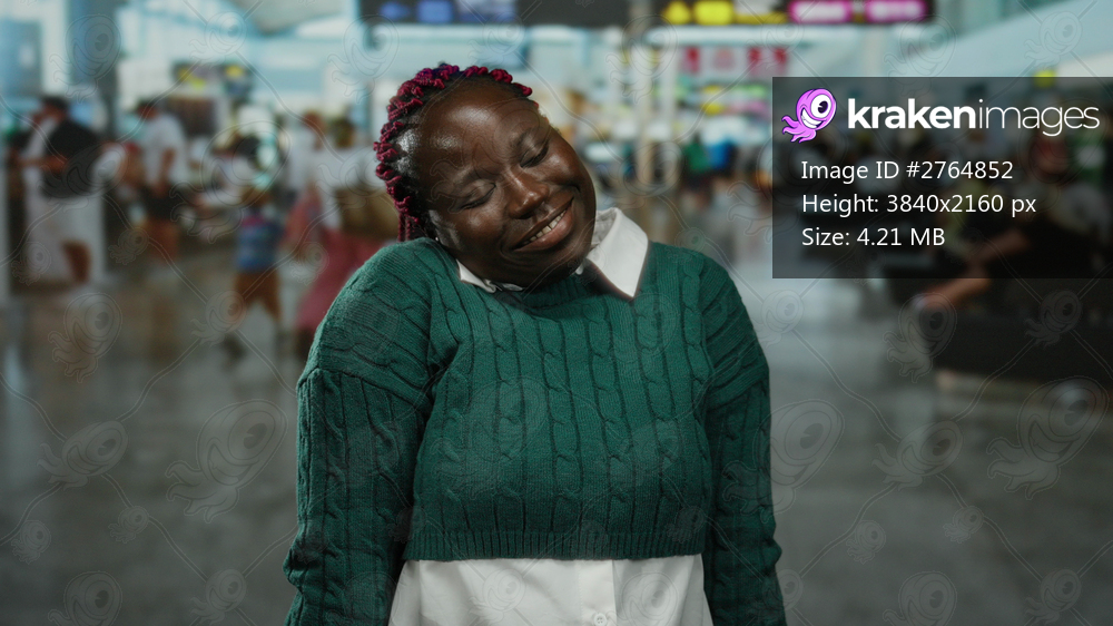 Woman in green sweater standing at an airport terminal with a happy expression, surrounded by busy travelers in an indoor airport setting.