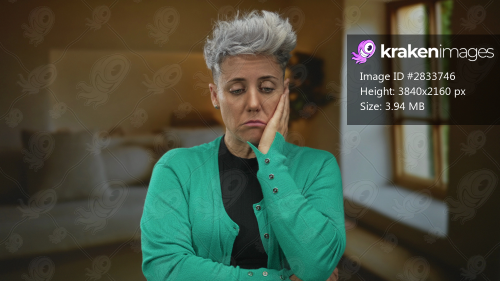 Woman in green sweater touches cheek with a sad and pained expression in a studio setting; melancholy.