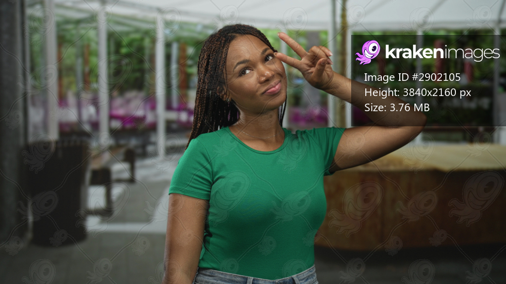 Woman in green t shirt showing v sign with hand by face in outdoor glass building terrace casual smile; playful confidence.