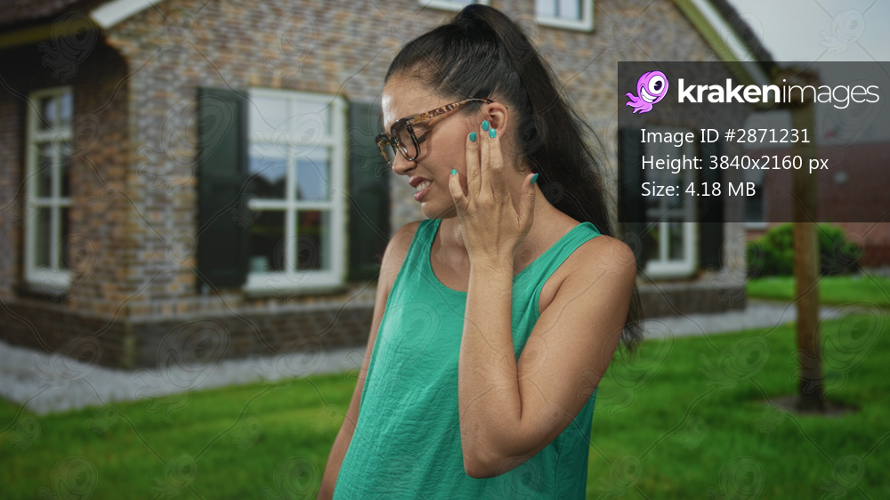 Woman in green tank top and glasses holds her cheek with her hand for toothache in front of a brown brick building entrance; pain.