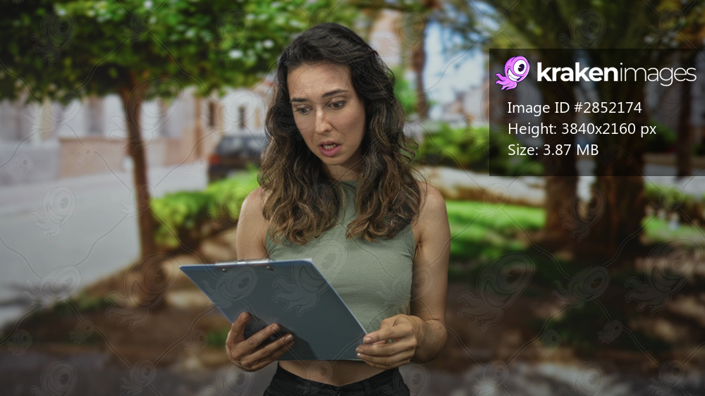 Woman in green tank top holding a clipboard of papers investigates documents while standing in street park under leafy trees; confusion.