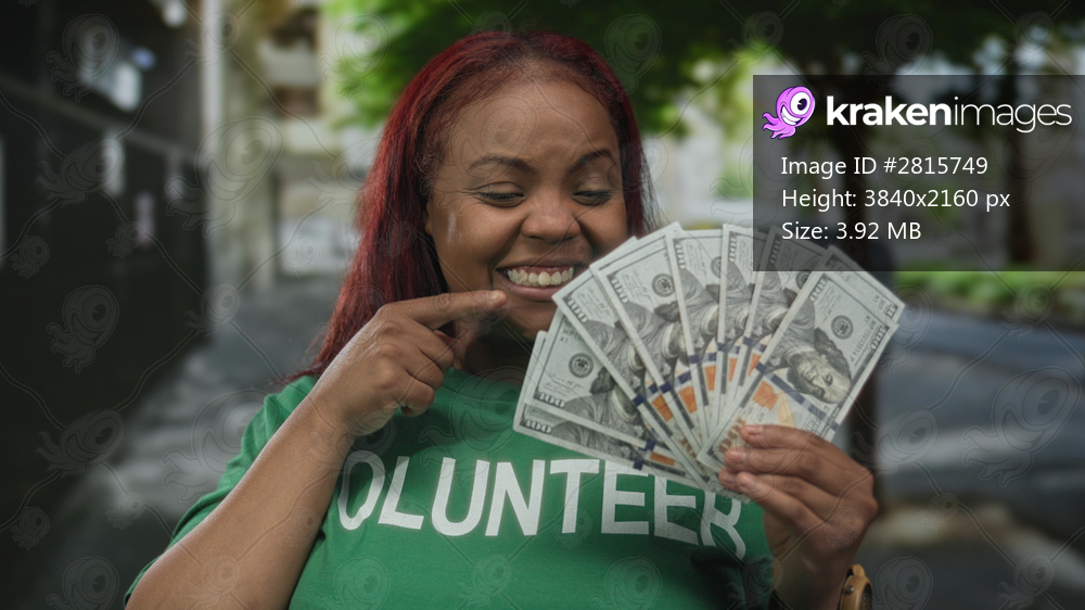 Woman in green volunteer shirt holds a fanned stack of cash with raised fist on street; donation joy.