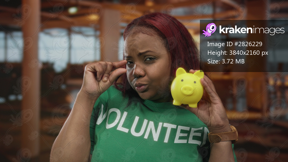 Woman in green volunteer shirt holds yellow piggybank and pinches small gap in hotel lobby; caution savings.