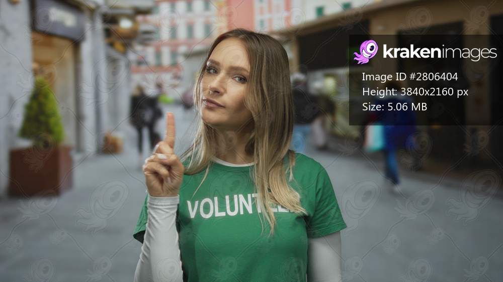 Woman in green volunteer shirt on city street gestures no with finger in outdoor urban setting, embodying youthful spirit and social service in a bustling environment. - Kraken Images