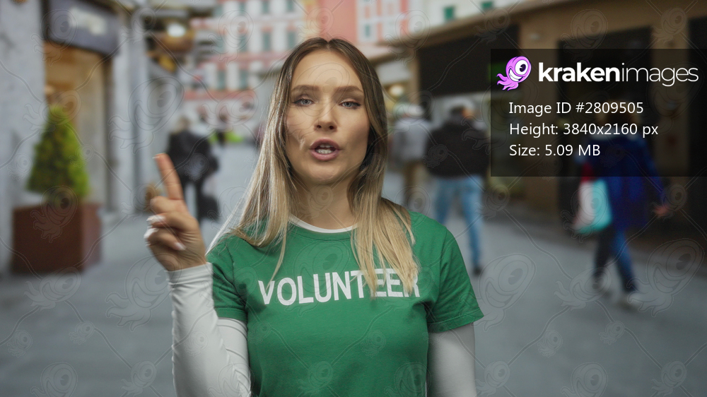 Woman in green volunteer shirt on city street gestures no with finger in outdoor urban setting, embodying youthful spirit and social service in a bustling environment. - Kraken Images