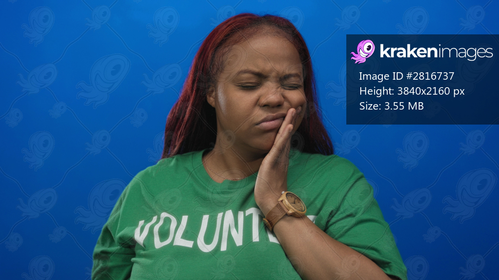 Woman in green volunteer shirt presses cheek with hand gesture in studio setting; toothache discomfort.