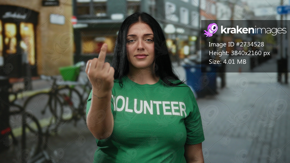 Woman in green volunteer shirt standing on city street makes unfriendly gesture, showing middle finger, with blurred urban background.