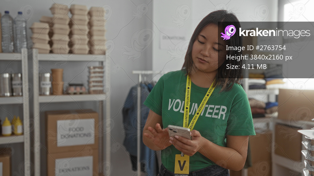Woman in green volunteer shirt using smartphone in a donation center filled with supplies and boxes, highlighting a young chinese volunteer in an indoor room setting. - Kraken Images