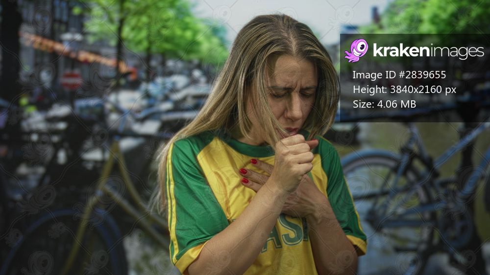 Woman in green and yellow soccer jersey coughs into fist on busy urban street by canal with parked bicycles and historic buildings; discomfort.