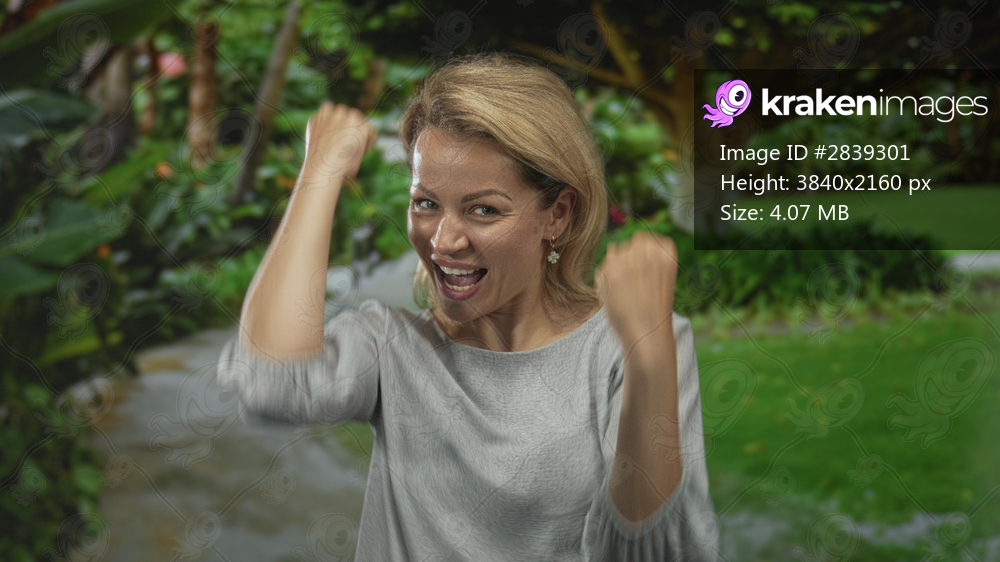 Woman in grey blouse raises clenched fists on leafy walking path in forest; celebration victory achievement triumph.
