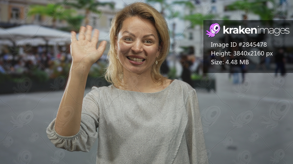 Woman in grey blouse smiling and waving hand at street with blurred crowd and building behind; greeting connection joy.