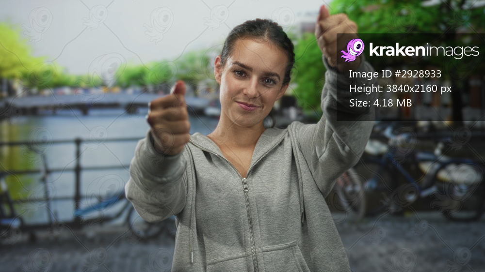 Woman in grey hoodie showing thumbs up on an amsterdam street beside a canal and bicycles; optimism encouragement friendliness.