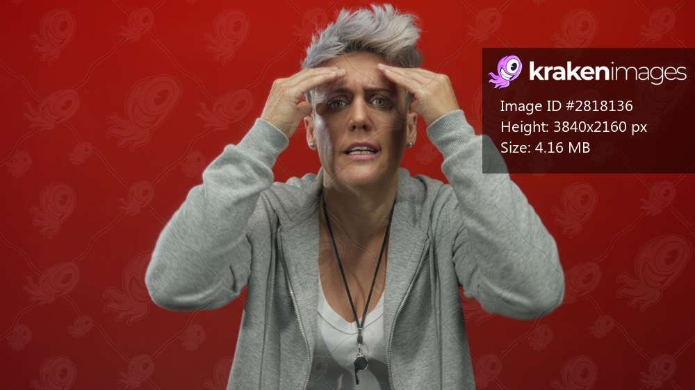Woman in grey hoodie and white tank top gestures hands near shoulders against red studio wall with a puzzled expression; frustration.