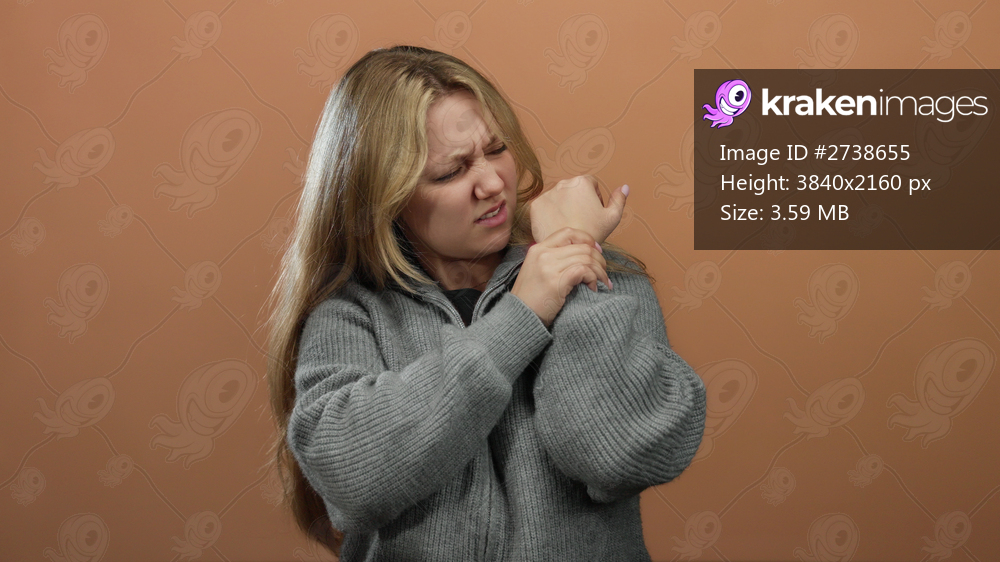 Woman in grey sweater examining wrist with concerned expression against brown background depicting discomfort and health awareness in isolated setting. - Kraken Images
