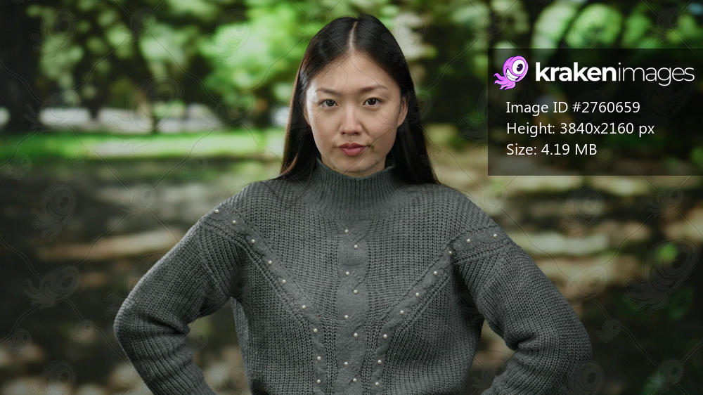 Woman in grey sweater standing confidently in a park with blurred green background outdoors during daytime, embodying a strong and determined expression. - Kraken Images
