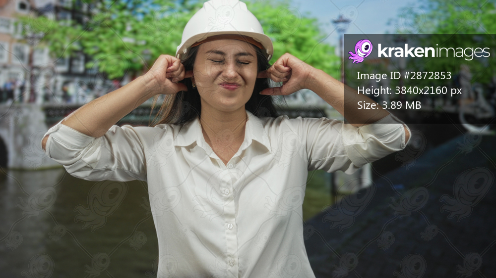 Woman in hard hat plugs ears with fingers on street in amsterdam wearing white shirt and grimaced face; construction noise annoyance.