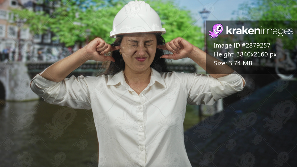 Woman in hard hat plugs ears with fingers on street in amsterdam wearing white shirt and grimaced face; construction noise annoyance.
