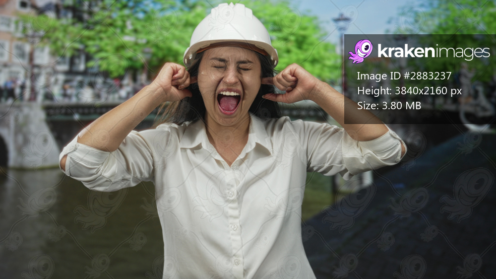 Woman in hard hat plugs ears with fingers on street in amsterdam wearing white shirt and grimaced face; construction noise annoyance.