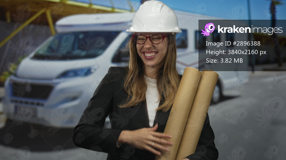 Woman in hardhat holds rolled plans while laughing on street; career confidence success achievement.