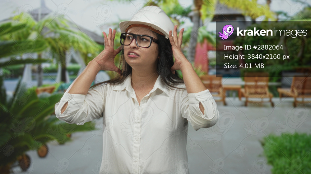 Woman in hardhat shouting with mouth open at hotel building, wearing glasses and white shirt; frustration.