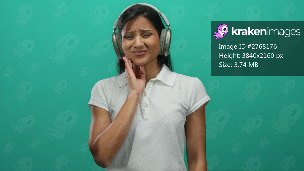 Woman in headphones expressing discomfort against a green wall, wearing a white shirt, latino, hispanic, young, music, isolated setting, sound, experiencing, problem. - Kraken Images