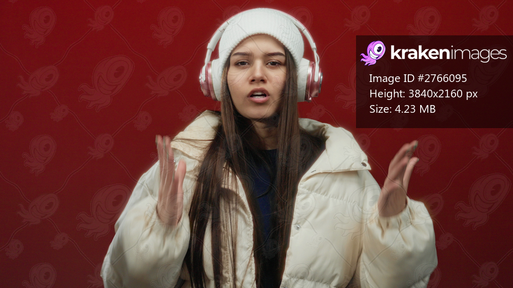 Woman in headphones wearing a white jacket and beanie stands against a vibrant red background, with an expression of contemplation and focus, captured in a close-up portrait. - Kraken Images