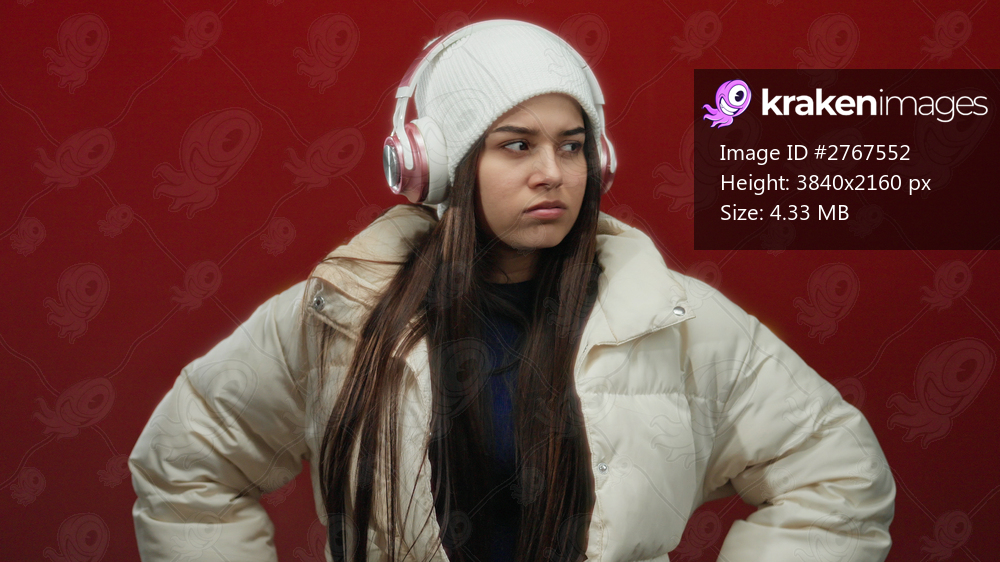 Woman in headphones wearing a white jacket and beanie stands against a vibrant red background, with an expression of contemplation and focus, captured in a close-up portrait. - Kraken Images