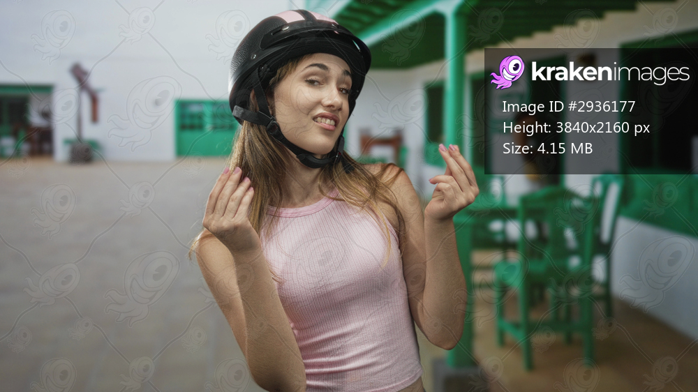 Woman in helmet making finger pinch gesture with bare shoulders visible at building courtyard; playful attitude.