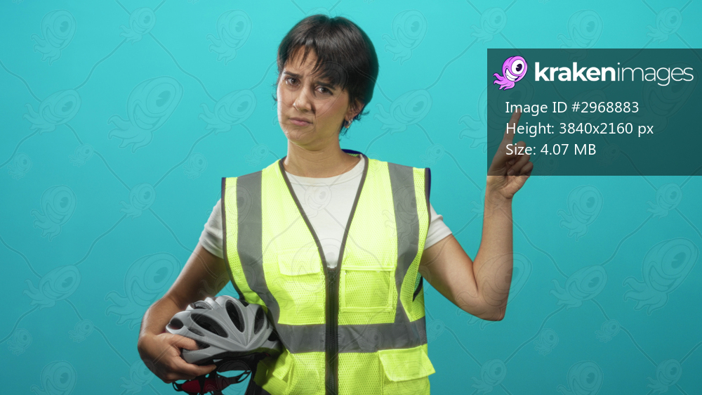 Woman in high visibility vest holding a bicycle helmet and pointing index finger upward to the right in studio; caution safety reminder.