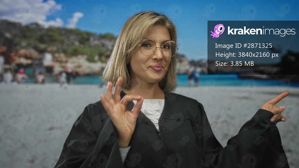 Woman in judge robe makes ok sign with left hand and points finger with right hand toward sea on sunny beach; approval highlight confidence justice.