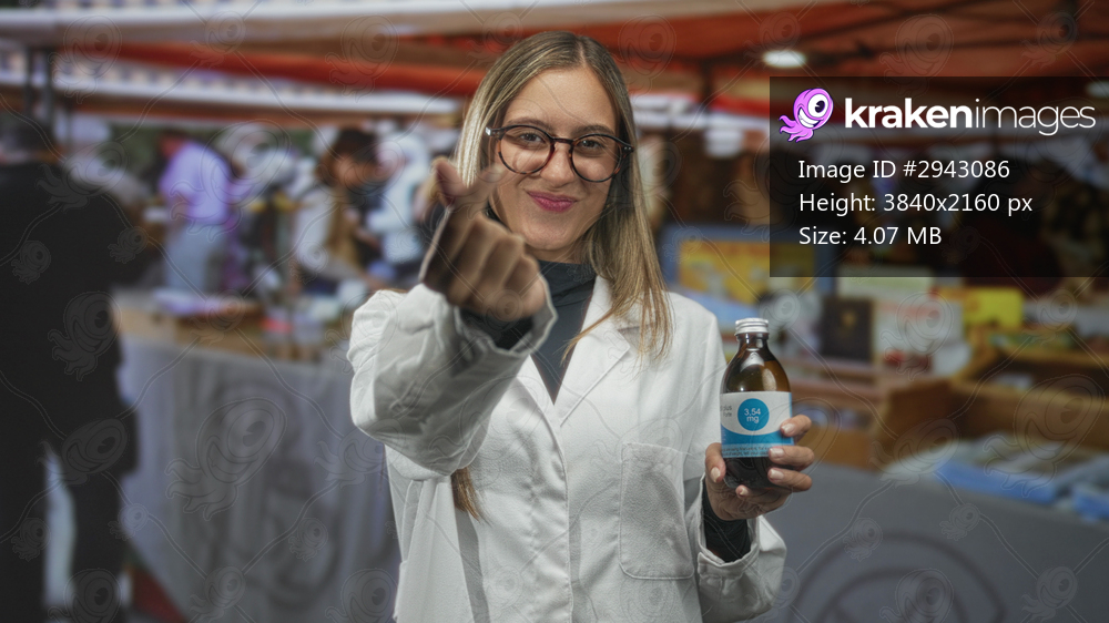 Woman in lab coat holding a brown glass bottle and making a finger heart at an indoor market building; cheerful product promotion.
