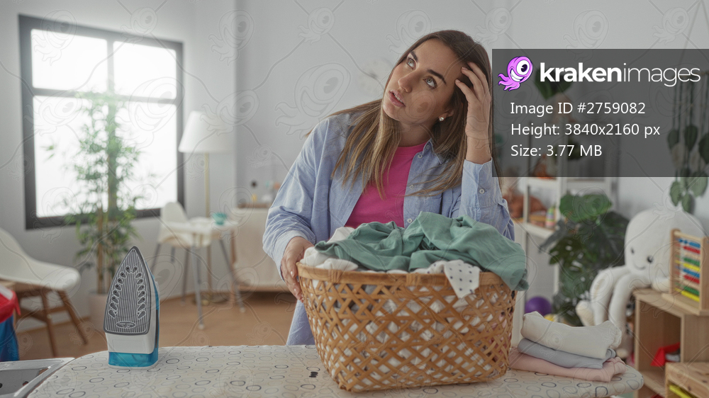 Woman in laundry room holding basket of clothes with an iron nearby, appearing distressed while surrounded by home decor and plants in an indoor setting. - Kraken Images