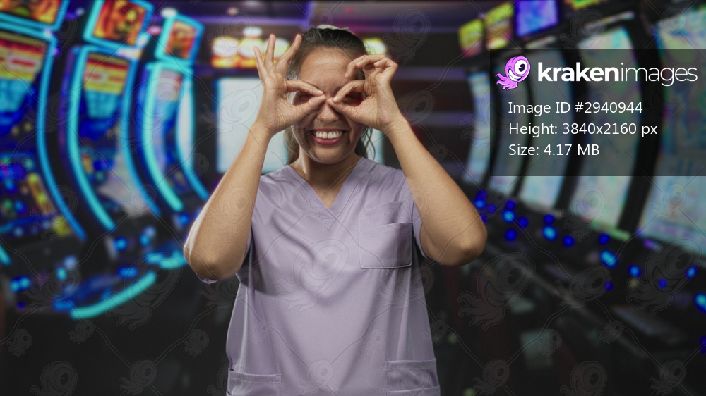 Woman in lavender scrubs smiling and showing ok sign with hands over eyes at slot machine in casino building; playful joy.